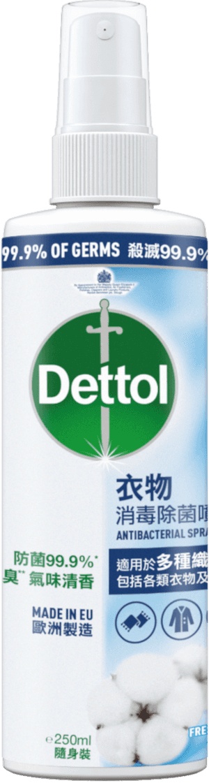 Dettol Spray & Wear kills 99.9% of bacteria*, stopping unpleasant odours at the source.